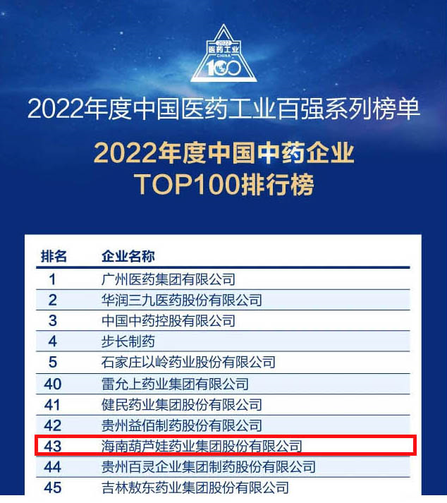 会议期间,一年一度的中国医药工业百强系列榜单隆重揭晓,PG药业集团凭借领先的研发优势和扎实的生产实力以及稳健的市场推广能力,连续第四年成功入选“2022年度中国中药企业TOP100排行榜” ,排名稳步上升至第43位。
